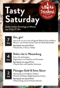 Der „Tasty Saturday“ lädt jeden ersten Samstag im Monat ab 11 Uhr dazu ein, Spannendes und Wissenswertes über regionale und internationale Manufakturen, Familienbetriebe, Destillerien oder Weingüter kennenzulernen – und natürlich auch dazu, deren wunderbare Köstlichkeiten zu probieren. Diese Spezialitäten haben absolutes Suchtpotential und so ist es doch sehr beruhigend, dass man sie alle in der Innkaufhaus Feinkost erwerben kann. Mehr Infos zu den Tasty-Terminen des Sommers: www.innkaufhaus.eu