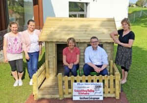 Sie haben schon mal gerne Platz genommen: Im neuen Spielhäuschen für die Buben und Mädchen der Eulengruppe des Katholischen Kinderhauses St. Katharina in Pfaffing – Evi Berger, die Gruppenleitung der Eulengruppe und Thomas Reihofer von der ‚meine Volksbank- Raiffeisenbank‘ in Pfaffing. Letzterer übergab nämlich jetzt stolze 1500 Euro als Spende dafür.