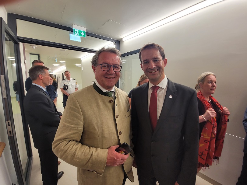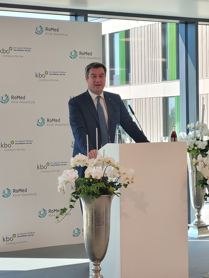 „Dankeschön an die beiden Träger für die Realisierung dieses Großprojekts. Es ist viel Geld, das hier investiert wird, auch wenn der Freistaat viel dazu gibt – das muss man erst mal schultern“, zeigt sich Markus Söder dankbar für den Einsatz in der Region. Es sei für viele Menschen großartig, und die Zukunft sei mit der medizinischen Versorgung dadurch in der Region stabil. „Krankenhäuser sind ganz entscheidend. Es sind Lebenshäuser, denn hier wird das Leben wieder gesundet. Wir wollen die Krankenhausförderung auf höchstem Niveau lassen – auch für den nächsten Bauabschnitt hier – das ist sehr wichtig“, blickt der Ministerpräsident in die Runde der Ehrengäste, zu denen auch der ehemalige Geschäftsführer des Inn-Salzach-Klinikums Dr. Theodor Danzl gehörte. Danzl hatte das Projekt mit erarbeitet und zeigte sich angetan vom Gesamtprojekt.