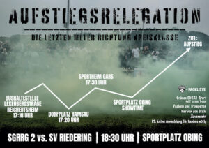 Die Partie findet in einem ‚Do-Or-Die‘-Spiel auf neutralem Platz statt. Gewinnt die SGRRG II steigt sie in die Kreisklasse auf und der SV Riedering muss den Gang in die A-Klasse antreten. Entscheiden die Riederinger die Partie für sich, bleiben sie in der Kreisklasse und die SGRRG II in der A-Klasse. Für die Begegnung wurde vom BFV die Sportanlage des TV Obing bestimmt.