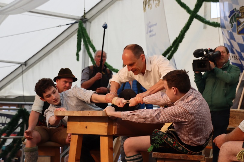 Für Festwirt Georg Lettl und Schirmherr Josef Huber gab es ein ganz besonderes Schmankerl zum Start der Bayrischen Meisterschaft: Sie eröffneten mit einem wertungsfreien Hakln, das letztlich Georg Lettl gegen den stellvertretenden Landrat gewann.