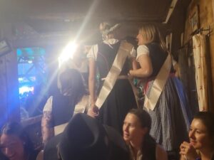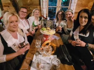 Die perfekte Feier-Kulisse war für die Ladys die Wiesn-Alm, hier spielte Just Duty Free. Schon früh am Abend wurde auf den Bänken getanzt, Marina zierte ein Blumenkränzchen. Und wie es der Brauch eines Junggesellinnen-Abschieds so mit sich bringt: Einige Aufgaben warteten auf die Riederingerin, die sich freute, dass sie in Tracht ihren JGA feiern kann.