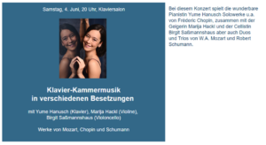 Schöner Benefizabend am Pfingstsonntag: Bunte Kammermusik mit dem Klaviertrio der bekannten Pianistin Yume Hanusch aus Edling