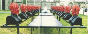Der Künstler jedoch sagte ab. Nun hatte man sich auf DAS EI DES KOLUMBUS geeinigt. Es stellt 24 Personen dar, die um einen Tisch sitzen. Die Skulptur stammt von Andreas Kuhnlein und wurde aus Eisen und Holz gefertigt. Feuerwehrzufahrt oder freies Vorbeigehen seien sichergestellt, heißt es aus dem Rathaus.