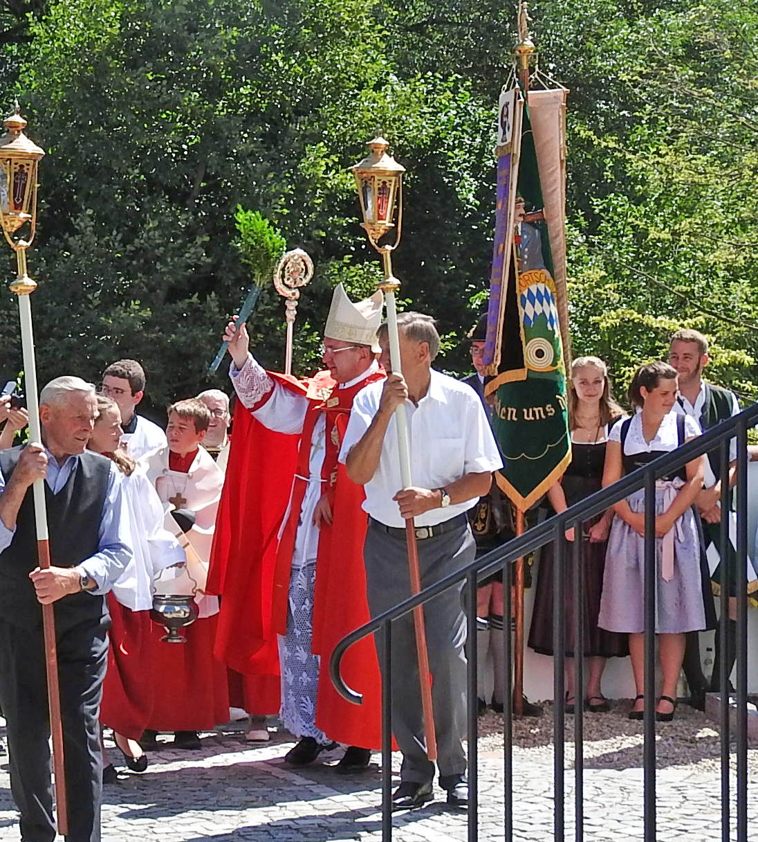 Dem Gotteshaus in Rettenbach zu Ehren gab es den Festgottesdienst neben der Kirche mit H.H. Erzabt Dr. Korbinian Birnbacher (unten Bildmitte). Mit dem Pfaffinger Pfarrer Josef Huber an der Seite sowie – zur großen Freude vieler Anwesenden – auch mit dem früheren Geistlichen der Kirchengemeinde, Pfarrer Willibald Mittermeier (rechts im Bild unten). Welch wunderbares Wiedersehen.