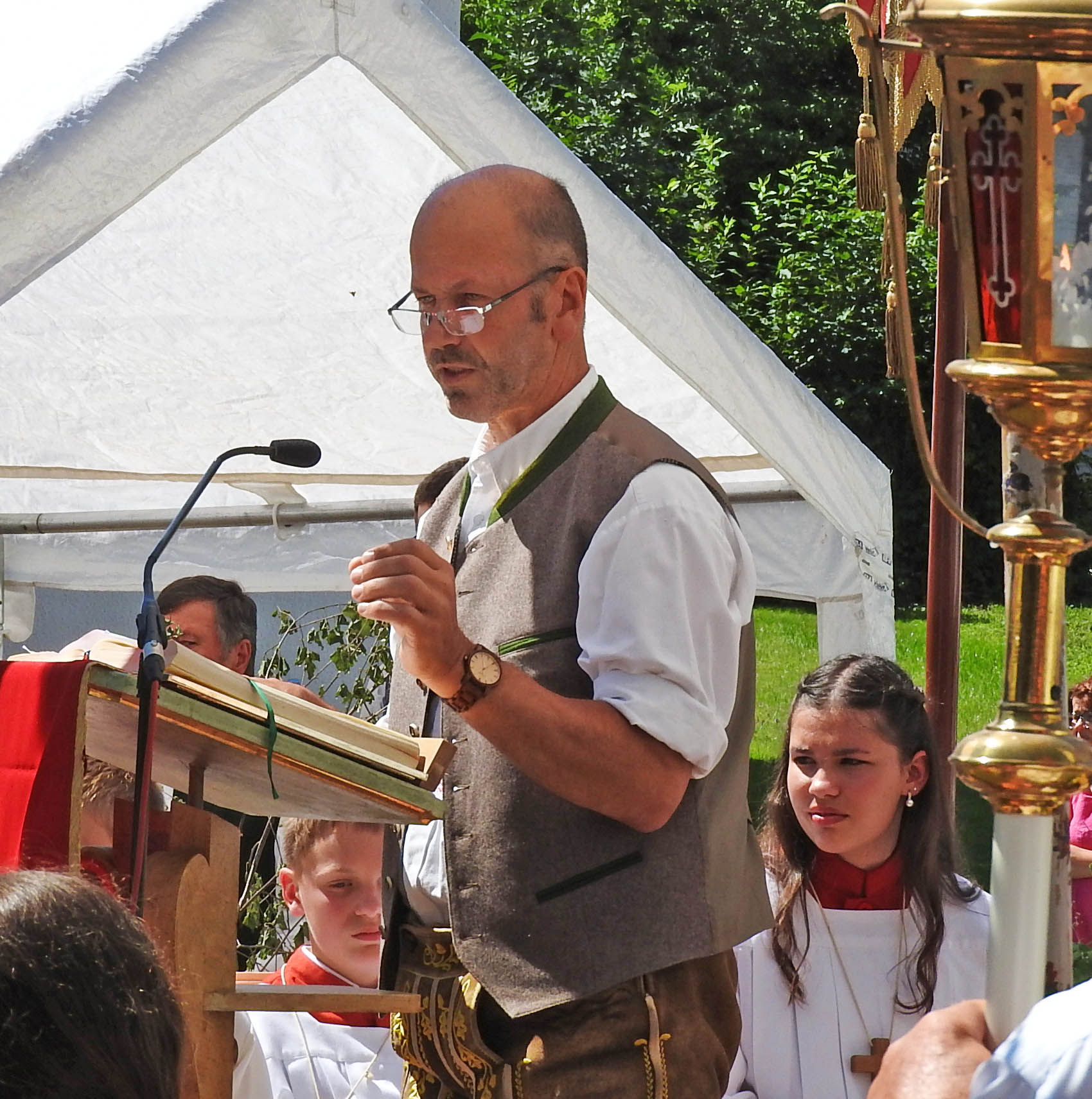 Stellvertretend genannt für die ganze Kirchenverwaltung samt rührigem Festausschuss: Er hatte einen großen Anteil am Gelingen der Renovierung, weil er sich als Bauleiter engagiert die ganze Zeit lang ehrenamtlich einbrachte – Hans Hanslmaier (Foto unten), der am Ende des Gottesdienstes ein herzliches Vergelt’s Gott an alle rund um die Planung und Vollendung der Sanierung sowie ganz besonders auch an alle anwesenden Vereine für ihr Kommen aussprach …