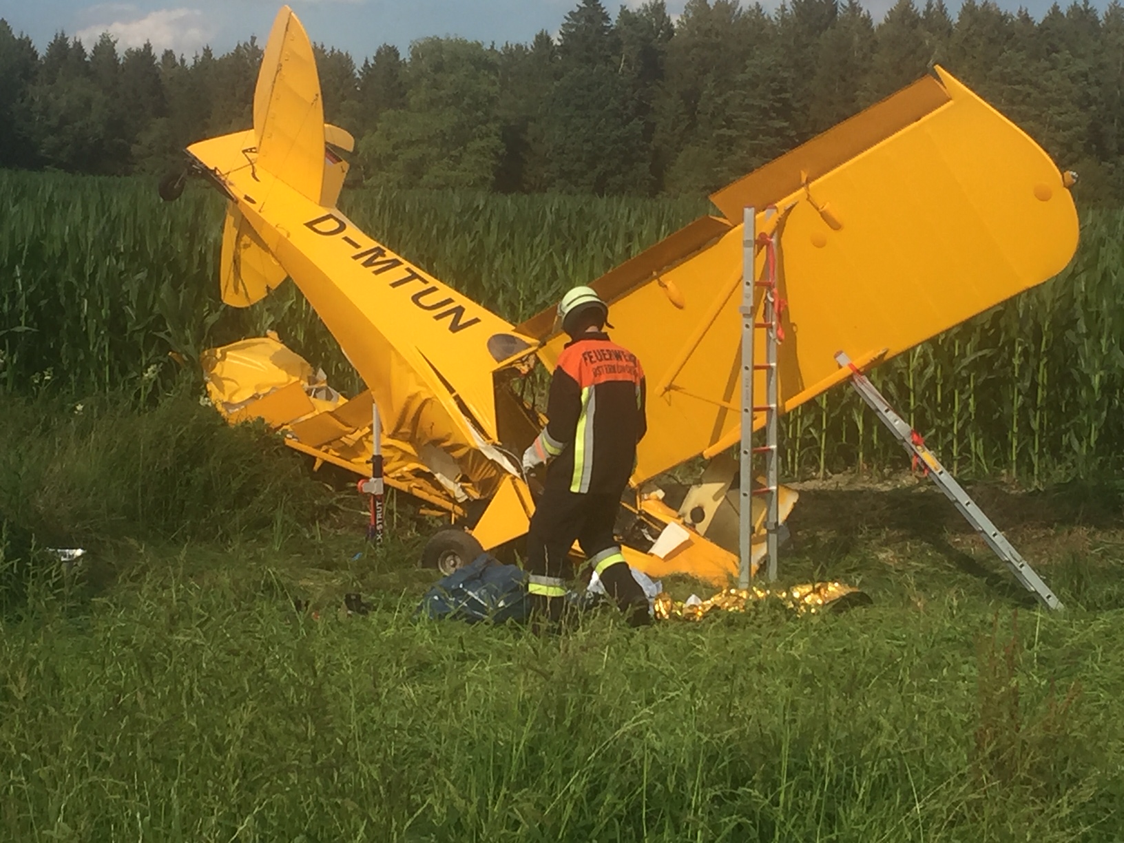 Alarm für die Feuerwehren im westlichen Landkreis Rosenheim und im Landkreis Ebersberg: Zwischen Tuntenhausen und Aßling ist nahe der Staatsstraße 2080 am Mittwochnachmittag gegen 16.30 Uhr ein Leichtflugzeug abgestürzt. Auch Notärzte und Rettungsdienst wurden alarmiert. Im Einsatz sind die Wehren aus Tuntenhausen, Ostermünchen, Aßling und Lampferding. Von der Unfallstelle heißt es, dass die beiden Flugzeuginsassen schwer verletzt wurden. Fotos: Georg Barth
