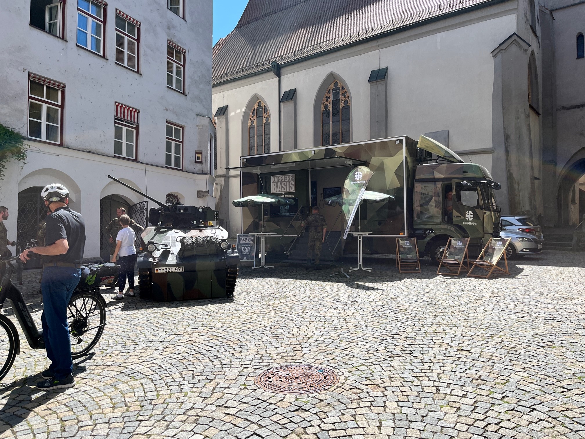 Manch Wasserburger und auswärtiger Besucher staunte heute nicht schlecht: In der Herrengasse stand morgens ein Tieflader, der einen leichten Wiesel-Panzer der Bundeswehr geladen hatte. Nachdem die Bundeswehr zusätzliches Gerät und ihren Info-Truck hinter der Frauenkirche abgestellt hatte, war das Rätsel gelöst: Die Streitkräfte informieren heute den ganzen Tag in Wasserburg über Karrieremöglichkeiten bei und den Dienst in der Bundeswehr.
