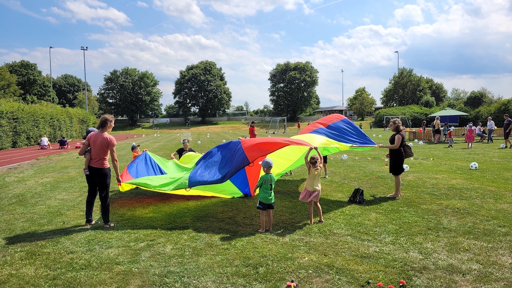 Michaela Mayerhofer, Abteilungsleiterin Breitensport des TSV Eiselfing, und ihr ehrenamtliches Helferteam hatten sich mächtig ins Zeug gelegt. Egal, ob an einer der vielen sportlichen Geschicklichkeitsstationen, beim Tanzen, in der Hüpfburg, bei einer Fahrt mit der Eisenbahn oder beim Kinderschminken – alle Besucher kamen voll auf ihre Kosten. „Es war uns wichtig, ein buntes, sportliches und offenes Fest für Kinder und Familien zu organisieren.“