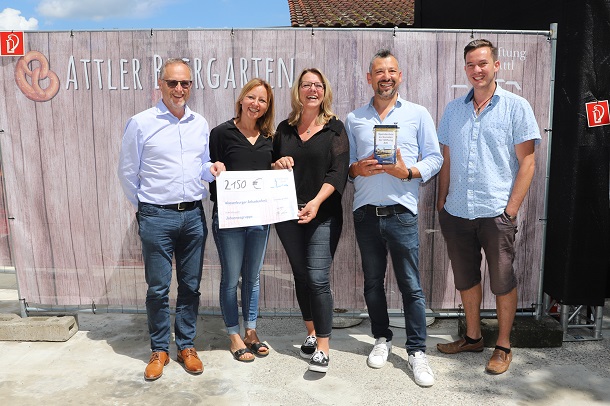Foto: Vorstand Franz Hartl (links) und Gruppenleiter Stefan Hoffmann (Zweiter von rechts) begrüßten Karin Reich, Manuela Rechenauer und Albert Lex im Attler Biergarten zur Spendenübergabe.