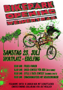 Zur Einweihung des neuen Bikeparks Weihertrail findet an diesem Samstag, 23. Juli, am Fußballplatz in Eiselfing – am Pfarrer-Möderl-Weg – ein großer Aktionstag statt. Mit Speed-Contests und einigen weiteren Attraktionen auf und neben dem Trail. Bike-Spaß für alle Altersgruppen ist garantiert. Veranstalter des Events ist die Gemeinde Eiselfing. Organisiert wird die Feier von einem Team aktiver Fahrer unter der Leitung des Jugendbeauftragten der Gemeinde, Alexander Lax.