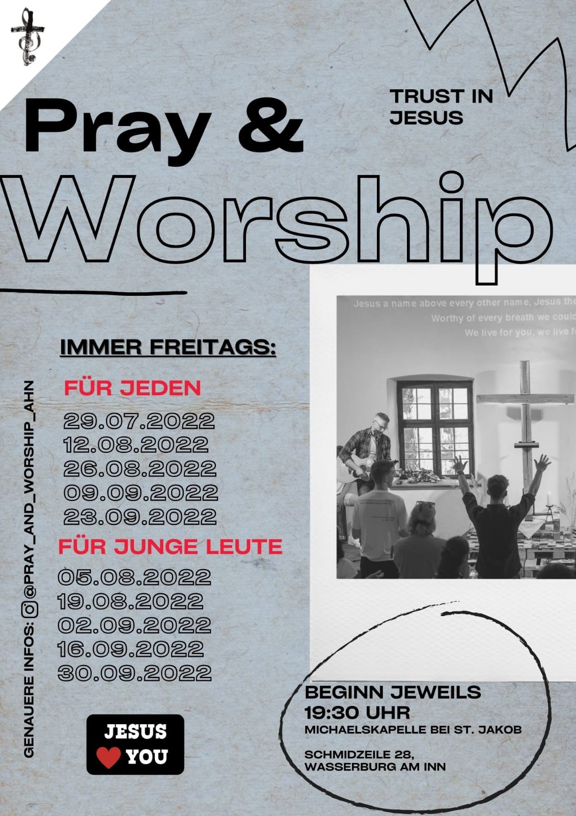 In der Regel findet jeden Freitag ein Event statt. Das Nächste ist am 29. Juli um 19:30 Uhr in der oberen Michaelskapelle. Neben den Freitagen wird versucht auch bei anderen Veranstaltungen und in den heiligen Messen der Pfarrgemeinden präsent zu sein. So findet im Rahmen der „Nacht der offenen Kirche“ in Rott am 30. Juli ein „Pray & Worship“ statt. Alle zwei bis drei Monate wird ein größerer Gebetstabend veranstaltet, bei der bisher um die 100 Personen kamen. Dabei ist die Zielgruppe nicht nur auf junge Leute beschränkt und wenn, dann wird dies speziell in der Ankündigung bekannt gegeben. Also auch ältere Erwachsene sind willkommen. All dies findet in einem modernen Rahmen statt, der vor allem junge Leute anspricht.
