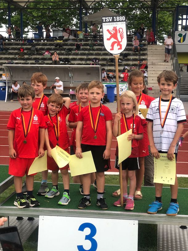 Im Rahmen des Teamwettbewerbs zum Wendelstein-Cup traten in Vaterstetten neun Wasserburger Leichtathletik-Kinder aus der U8 im Team an. Die Disziplinen, die sie bewerkstelligen mussten, sind alle vorbereitend für die „tatsächlichen“ Disziplinen später einmal.