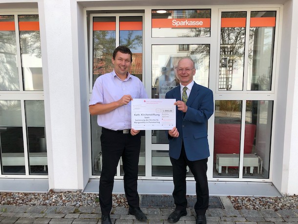 Martin Weiderer (links), Leiter der Sparkassengeschäftsstelle Isen, übergab den Spendenscheck an Pfarrer Josef Kriechbaumer.