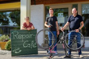 Sie freuen sich aufs Reparieren, Basteln und Werkeln: Ute Gasteiger vom Arbeitskreis Umwelt, Umweltreferent Matthias Eggerl und Bürgermeister Daniel Wendrock.