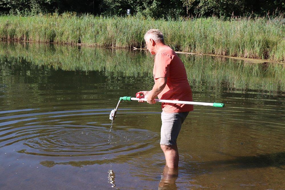 Etwa 250 Milliliter braucht das Labor für die Prüfung. Helmut Faber watet einige Meter rein in das seichte Wasser. Der Behälter für die Probe hängt an einer langen, grünen Stange. Es ist 9 Uhr – bis auf zwei Frühschwimmerinnen steht der Hygienekontrolleur alleine im Wasser und taucht den Behälter weit unter die Oberfläche. Hat er genug Wasser, kommt noch die Sichtprüfung. Eine sogenannten Sichtscheibe wird ins Wasser gelassen, um zu prüfen, ob ein Kind, das in den See fällt, beispielsweise bei zwei Meter Tiefe noch zu sehen ist.