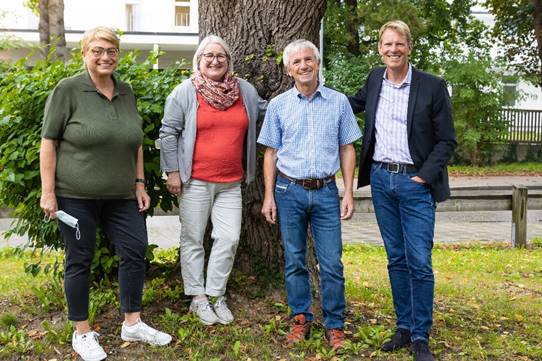 Fotot: Der langjährige Betriebsratsvorsitzende Volker Schmidt (Zweiter von rechts) wird von RoMed-Geschäftsführer Dr. Jens Deerberg-Wittram (rechts), Pflegedirektorin Judith Hantl-Merget (links) und der Leiterin der Personalabteilung Christine Halfstad (Zweite von links) in den wohlverdienten Ruhestand verabschiedet.