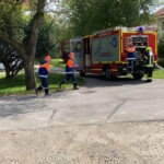 Damit bei einem späteren Übungseinsatz alle Geräte sofort in den Feuerwehrautos gefunden werden, konnten sich alle Jugendfeuerwehrler im Anschluss die Einsatzfahrzeuge „Florian Schonstett 43/1“ und „Florian Schonstett 65/1“ noch einmal genau anschauen. Dies wurde aber um 13.28 Uhr durch den ersten Übungseinsatz abrupt unterbrochen, so mussten schnellstmöglich die Löschanzüge angezogen werden, um zu einem Garagenbrand nach Zillham auszurücken.