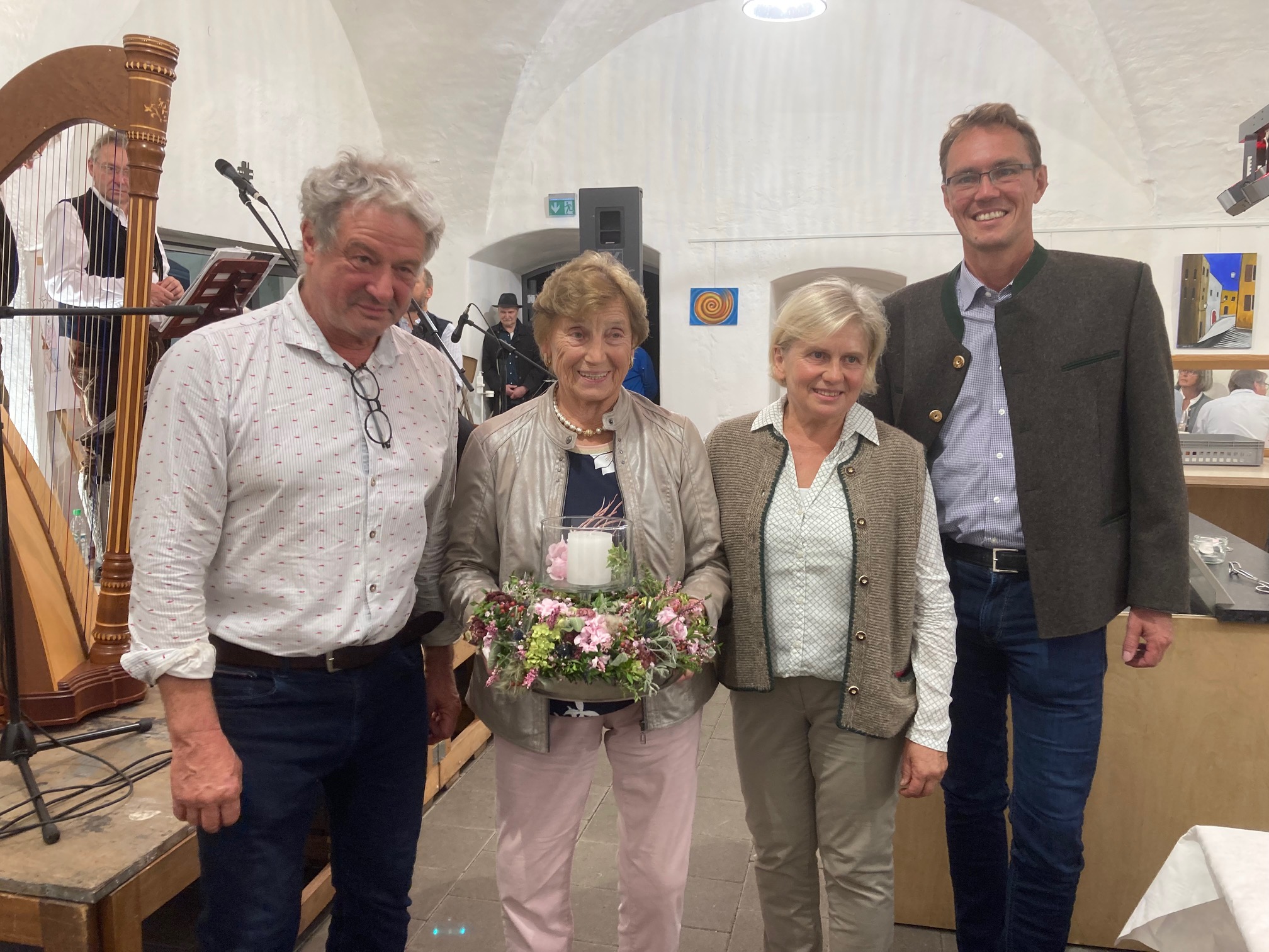 Auch Hederer hatte noch eine Überraschung, denn „was ist eine Jubiläumsfeier ohne Ehrung?“ Es gebe aus dem Team so viele Leute, die er gern für ihr ehrenamtliches Engagement ausgezeichnet hätte, aber „dann bleibt niemand mehr übrig“. Inzwischen habe jeder Aufgaben übernommen und der Bauernmarkt sei ein großes Miteinander geworden. Jeder bringe sich ein – und das haben die Mitglieder des Bauernmarkts von Maria Waltl (Foto Zweite von links) gelernt. Als Dank überreichten (von links) Josef Hederer, Susi Stein und Stefan Högenauer ein Geschenk.