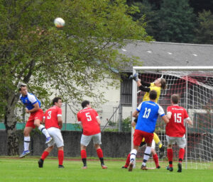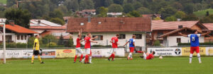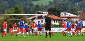 Mächtig was los im Schonstetter Strafraum – der A-Klassist (rotes Dress) hatte es mit dem Tabellenführer zu tun, dem SV Unterwössen auf dessen Platz. Und die Arbeit ging über 90 Minuten lang nicht wirklich aus für die Abwehrreihe samt ihrem hochaufmerksamen Goalie, dem Schonstetter Betzl Ludwig. Da musste so manche Glanzparade ausgepackt werden, um den Kasten sauber zu halten.