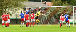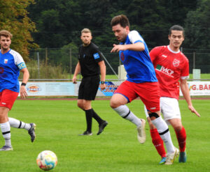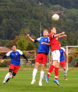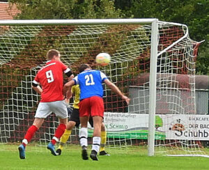 Auch Nik Weiß (blaues Dress Nummer 21) scheitert mit seinem Kopfball – das Leder geht knapp am Schonstetter Tor vorbei.