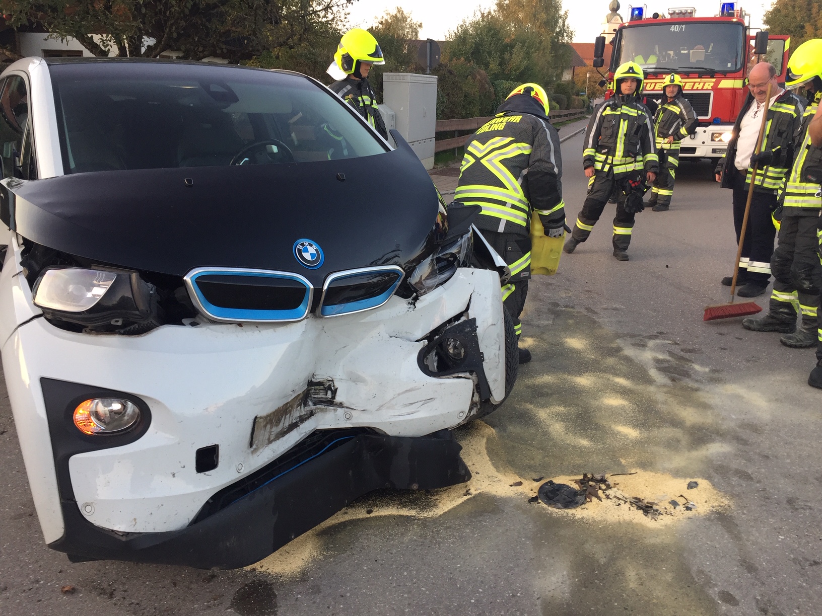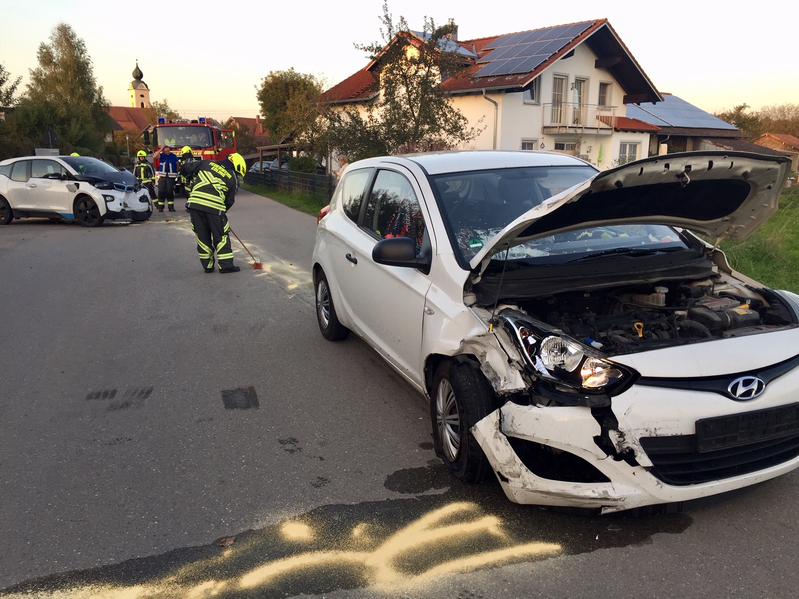 Erheblicher Sachschaden, aber zum Glück keine Verletzten: Zu einem Unfall in der Hochfellnstraße musste die Edlinger Feuerwehr am frühen Donnerstagabend ausrücken. Zwei Pkw waren in einem Kreuzungsbereich mit relativ geringer Geschwindigkeit zusammengeprallt, wurden aber dennoch massiv beschädigt. Die Fahrerinnen blieben unverletzt. Auslaufende Betriebsstoffe wurden von der Feuerwehr beseitigt. Fotos: Georg Barth