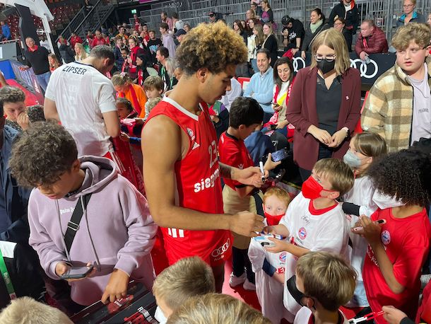 Die Aufregung war natürlich riesig bei den Kids und sie freuten sich sehr auf das Spiel. Als sogenannte „Courtside-Kids“ durften sie am Spielfeldrand ganz nah dabei sein, als sich die Bayernspieler und die Chemnitzer aufwärmten.