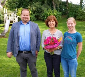 Auf dem Titelbild zum Jubiläum zu sehen sind Kita-Verwaltungsleiter, Herr Schneider, daneben Irmgard Breit und Michaela Liebhart (Einrichtungsleitung).