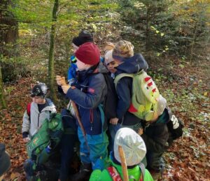 Im Wald können die Kinder sich darin üben, aufeinander Rücksicht zu nehmen und sich gegenseitig auf schwierigen Wegen, beim Klettern oder Holz holen zu unterstützen.