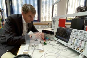 Professor Norbert Seliger bei Messungen für die drahtlose Energieübertragung im Labor für Leistungselektronik: Der weltweit führende Berufsverband in der Elektrotechnik und Elektronik hat ein an der Technischen Hochschule Rosenheim entwickeltes Prinzip für die drahtlose Übertragung von Energie ausgezeichnet. Die Forschungsarbeit wurde bei einer internationalen Tagung des Institute of Electrical and Electronics Engineers (IEEE) mit dem Best Paper Award bedacht.
