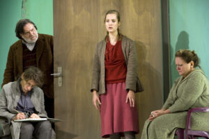 Bilder unten: Uwe Bertram als Schauspieler in „Der zerbrochene Krug“ von Kleist in einer Inszenierung von Andrea Breth auf der Ruhrtriennale 2009 – mit Wolfgang Michael, Marie Burchard und Swetlana Schönfeld (von links). Foto: Bernd Uhlig