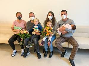 Foto (von links): Magdalena Appel mit dem jüngsten Nachwuchs Jakob und Ehemann Fabian mit dem älteren Sohn Korbinian sowie Maria Verfel mit der älteren Tochter Daria und Ehemann Evgeny mit der neugeborenen Tochter Sofia.