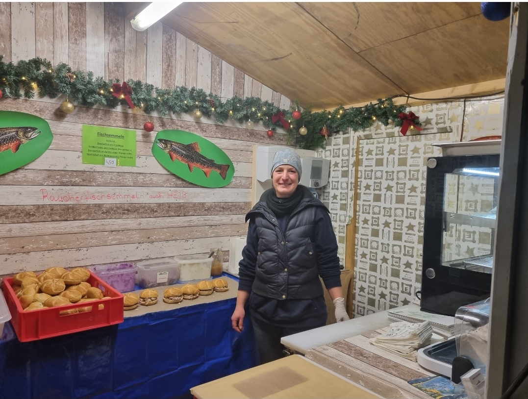 Weil der Wasserburger Christkindlmarkt im Bereich der Frauengasse auch donnerstags geöffnet hat, kann nach dem Einkauf auch noch ein Einkehrschwung genutzt werden, um Bratwurst, Punsch oder Lebkuchen zu erstehen. Dieses Jahr neu dabei in einer Markthütte ist Ruth. Sie verkauft Fischsemmeln – und zwar auch in warmer Version. Vom Bauernmarkt in der Hofstatt ist ihr Angebot schon bekannt, hier auf dem Christkindlmarkt kommen immer mehr Interessierte, die auf den Geschmack des eher noch ungewohnten Schmankerl gekommen sind. „Die guten Rückmeldungen freuen mich sehr“, heißt es von der Standlbesitzerin.