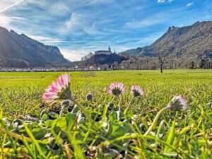 Temperaturen im zweistelligen Bereich und von der weißen Pracht weit und breit keine Spur mehr: Weihnachten 2022 mit frischen Blüten und Frühlingsgefühlen zwischen den Jahren. Beim Spaziergang am Fuße von Schloss Hohenaschau sprießen die Gänseblümchen in der grünen Wiese. Normalerweise blühen sie doch frühestens ab März …