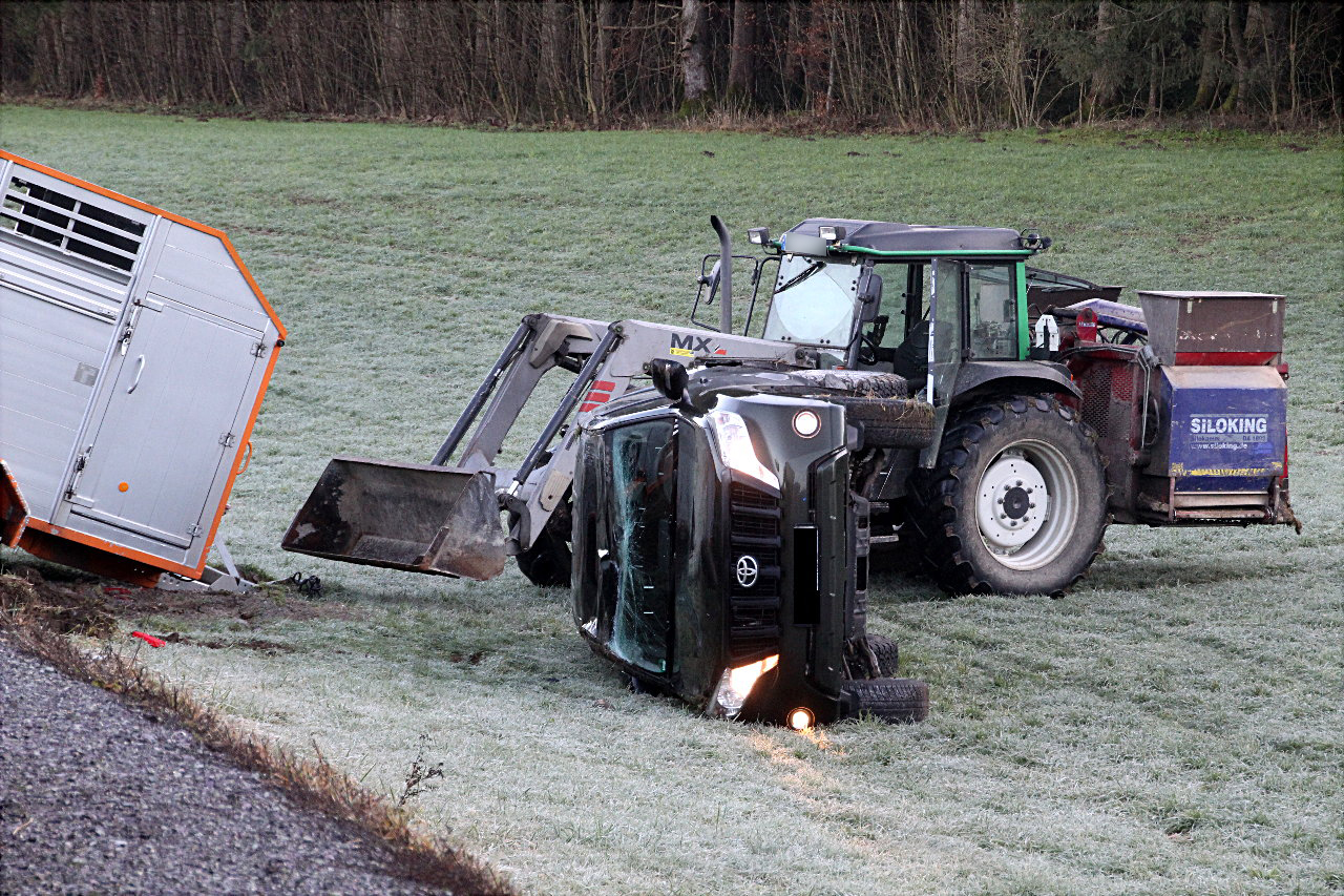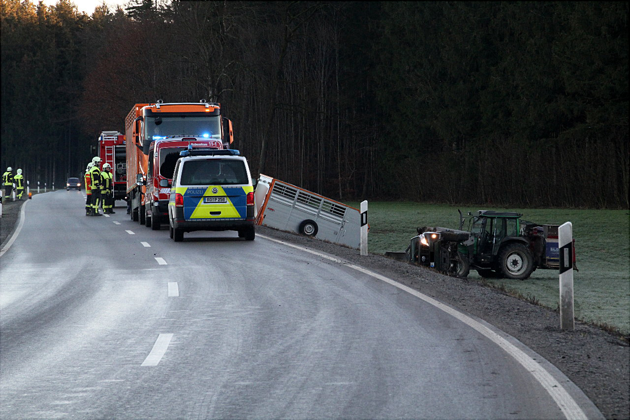 Ein 53-jähriger Fahrer aus dem Altlandkreis befuhr mit seinem Gespann die Staatstraße von der B304 kommend in Richtung Schnaitsee. In einer Linkskurve auf Höhe Sillerding verlor er aufgrund der spiegelglatten Straße die Kontrolle über das Fahrzeug und kam nach rechts von der Fahrbahn ab. Daraufhin überschlug sich das Fahrzeug. Der Fahrer blieb unverletzt.