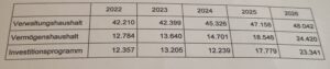Finanzplan und Investitionsprogramm weisen die aufgeführten Abschlusszahlen in Euro auf: