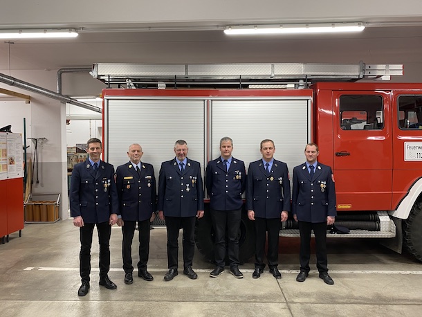 Kreisbrandmeister Hermann Kratz (Foto unten, Zweiter von links) informierte über das Feuerwehrgeschehen und bedankte sich bei der gesamten Mannschaft für den ehrenamtlich geleisteten Dienst. Im Anschluss führte er die Ehrungen der langjährigen Dienstleistenden durch.