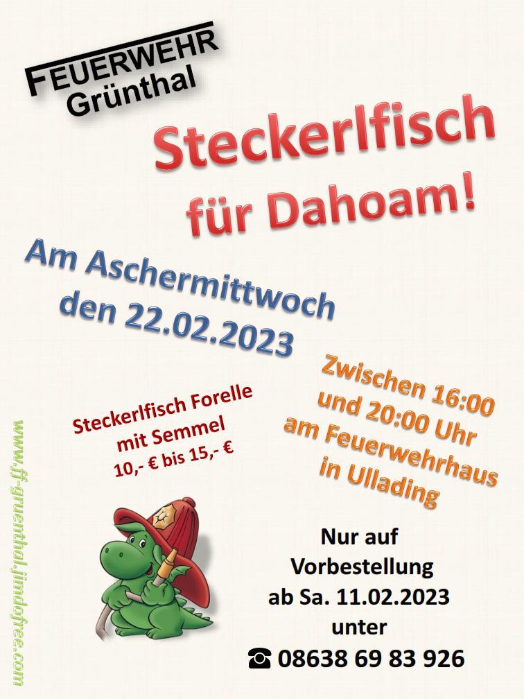 Die Feuerwehr Grünthal bietet am Aschermittwoch, 22. Februar, wieder besondere Schmankerl an: Steckerlfische für dahoam. Die Fische müsse allerdings vorbestellt werden. Vorbestellungen unter Telefon 08638/69 83 926. Die Fische könne am Aschermittwoch zwischen 16 und 20 Uhr am Feuerwehrhaus in Ullading abgeholt werden.