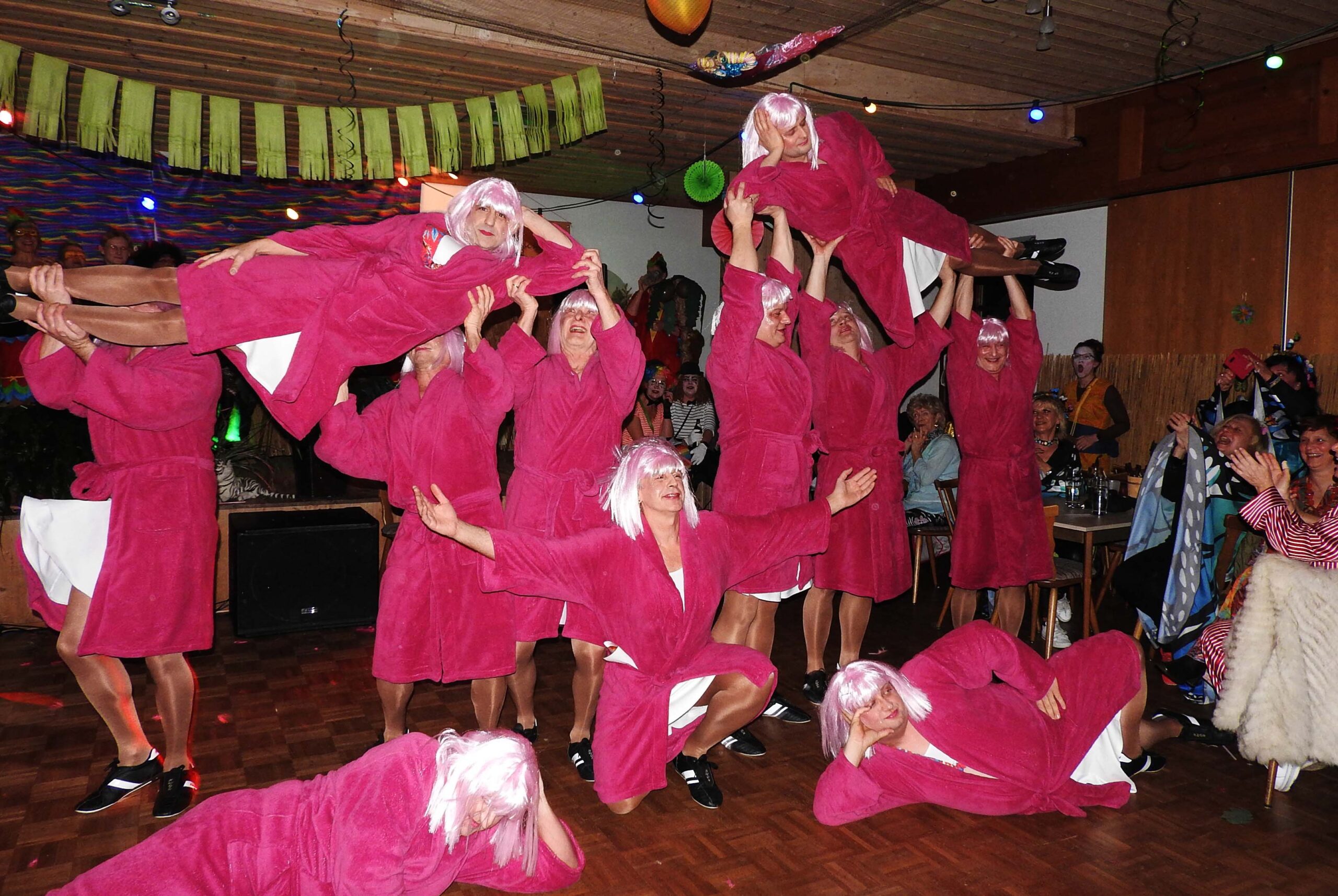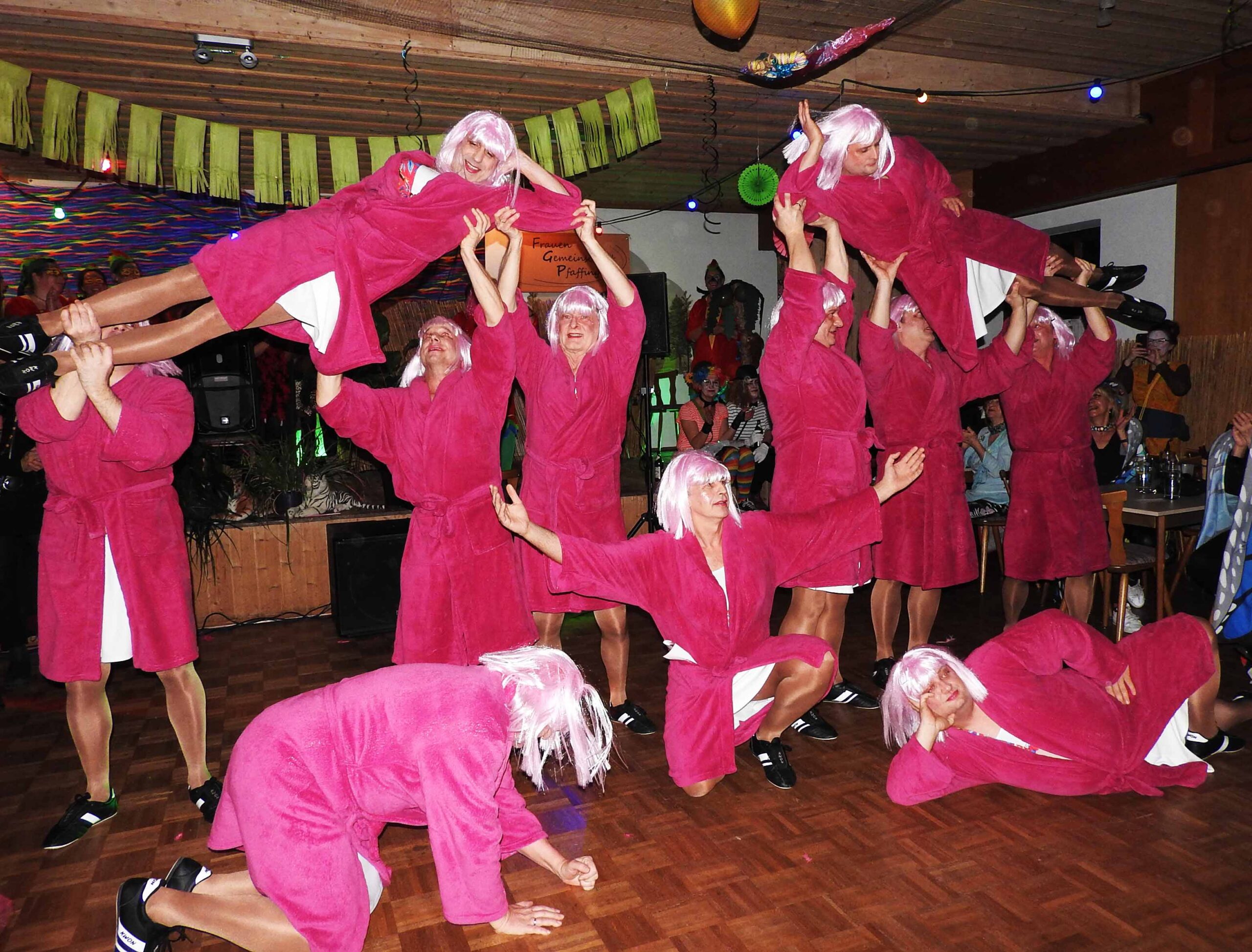 Ein absolutes Highlight – die Akrobatik der Traumtänzer aus Lengmoos, die ihr 25-jähriges Bühnenjubiläum feierten. Hier noch verkleidet mit Bademänteln, bevor die Hüllen fielen. Applaus für sie, die über Wochen fleißig trainiert hatten.