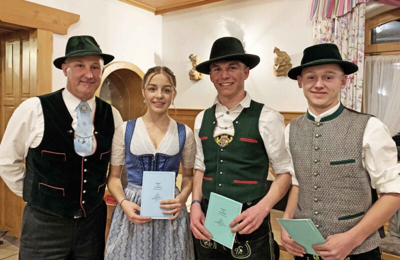 Alexander Huber (2. von rechts) sowie die Geschwister Paula und Lorenz Gottwald. Die Drei nehmen seit Kindertagen an den Plattlerproben teil und sind fester Bestandteil der Aktivengruppe des Trachtenvereins.