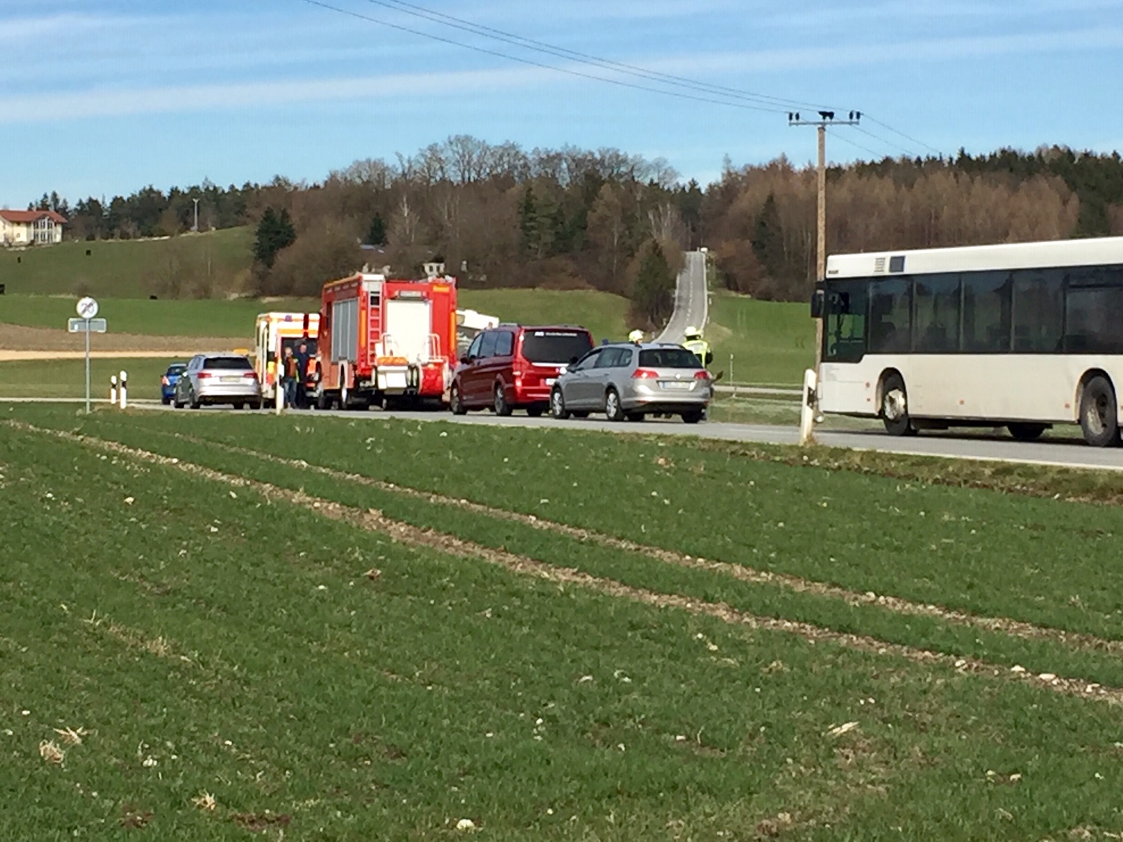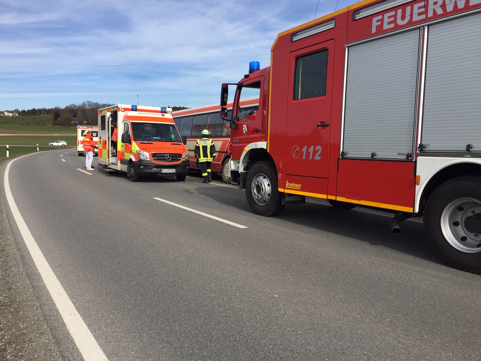 Einsatz für die Floriansjünger am frühen Freitagnachmittag: Ein medizinischer Notfall beim Fahrer stoppte heute Nachmittag einen Schulbus auf der Kreisstraße RO40 bei Soyen. Feuerwehr, Polizei und Rettungsdienst eilten zu Hilfe. Im Bus befanden sich zirka zehn Schulkinder. Sie blieben zum Glück unverletzt. Fotos: Georg Barth