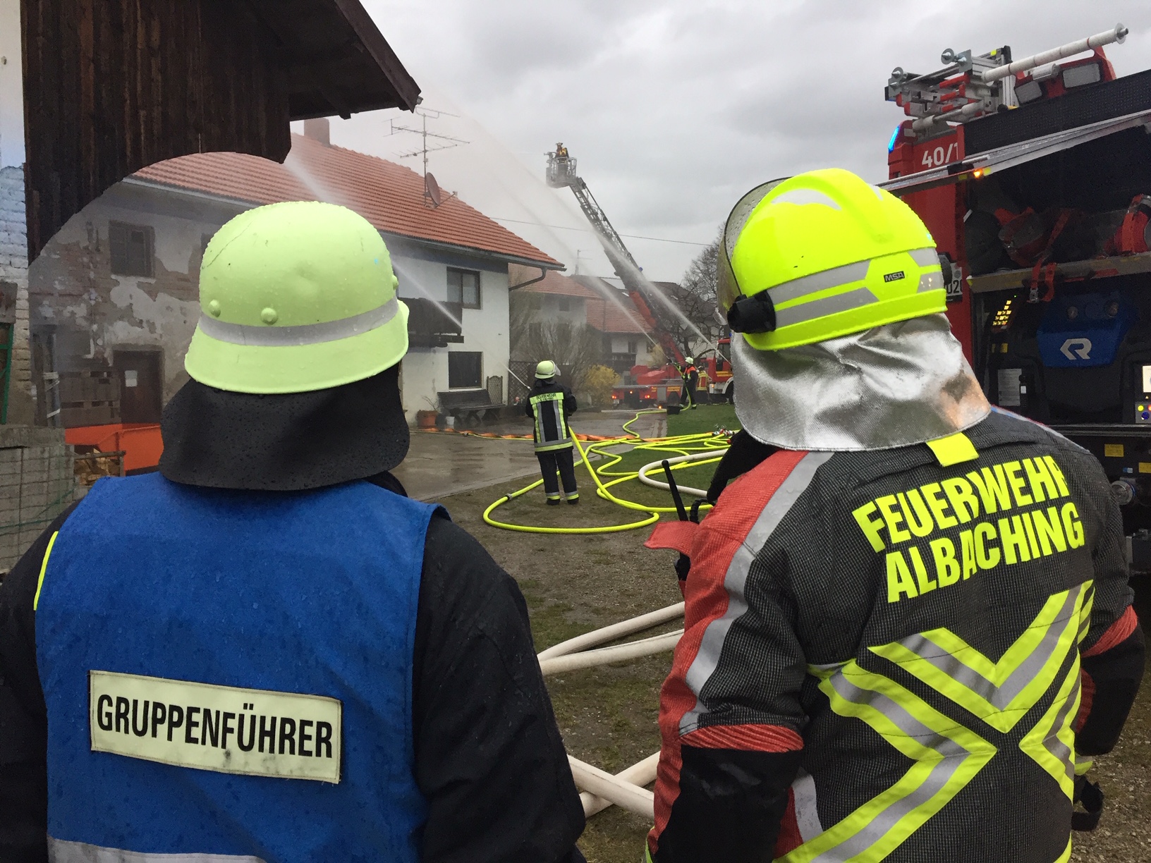 Großübung über die Landkreisgrenzen hinweg: Die Feuerwehren St. Christoph und Tulling (Landkreis Ebersberg), sowie die Wehren aus Haag (Mühldorf) und Albaching (Rosenheim) rückten am Freitagnachmittag zu einem „Einsatz“ nach Kalteneck aus. Dort wartete ein altes Bauernhaus als Übungsobjekt auf die Floriansjünger. Die Haager Feuerwehr rückte zusätzlich mit der Drehleiter an. Eineinhalb stunden wurde das Zusammenspiel der verschiedenen Feuerwehren bei der Brandbekämpfung geübt – und das zum Teil bei strömendem Regen. Fotos: Georg Barth