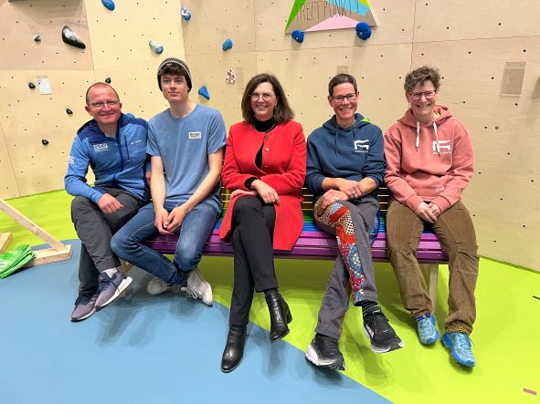 Statt Sektkorken knallten beim Einweihungssprung in die Halle einige Konfettikanonen und die Sektion GOC – der queere* Alpenverein sorgte für eine weitere Überraschung: Für den Treffpunkt im Bistro des Basislagers enthüllte Vorstand Thomas Michel eine Regenbogenbank, die in Zukunft am Treffpunkt im Bistro des Basislagers ein weiteres Zeichen für Toleranz und Vielfalt setzen wird.
