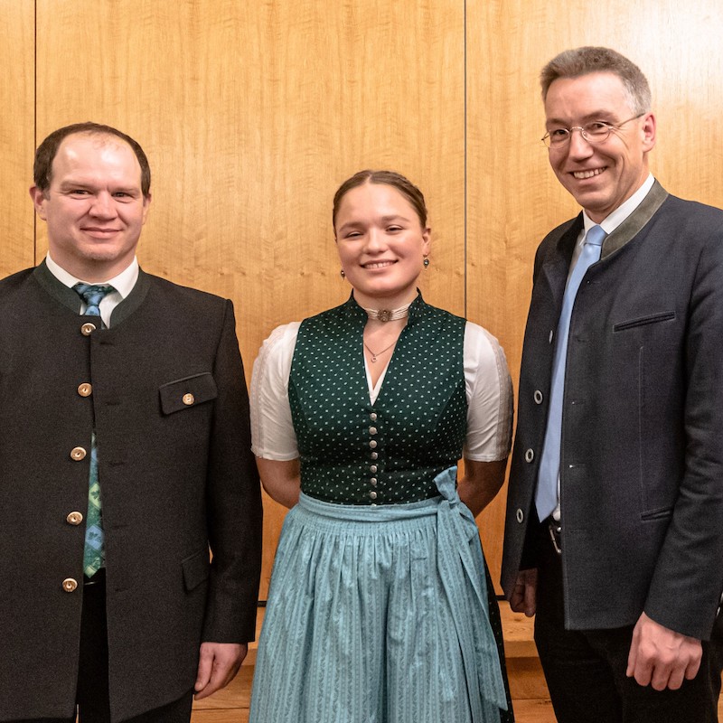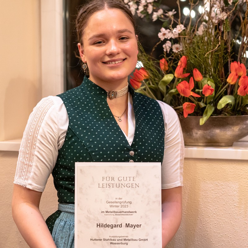 Nach einigen Staatspreisträgern, die bereits aus dem Familienbetrieb hervorgegangen sind, wurde heuer erneut eine Hutterer-Auszubildende für ihre überragenden Leistungen geehrt: Unter 46 Absolventen der Metallbau-Gesellenprüfung im Landkreis Rosenheim zählte Hildegard Mayer zu den besten drei Prüflingen und erhielt dafür auf der Freisprechungsfeier eine Auszeichnung von Landrat Otto Lederer (rechts) und Innungsmeister Christian Albersinger.