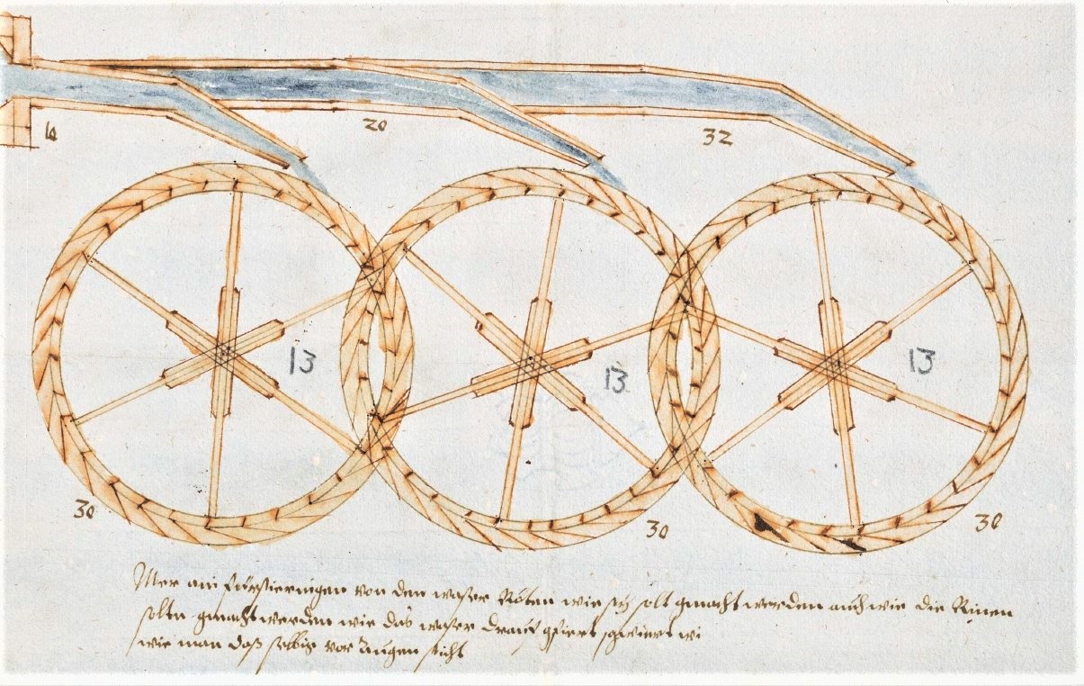 Zum Foto oben:Konstruktions-Zeichnung von drei oberschlächtigen Wasserrädern einer Mahlmühle und ‚wie das waser drauf gefiert‘ wird.
