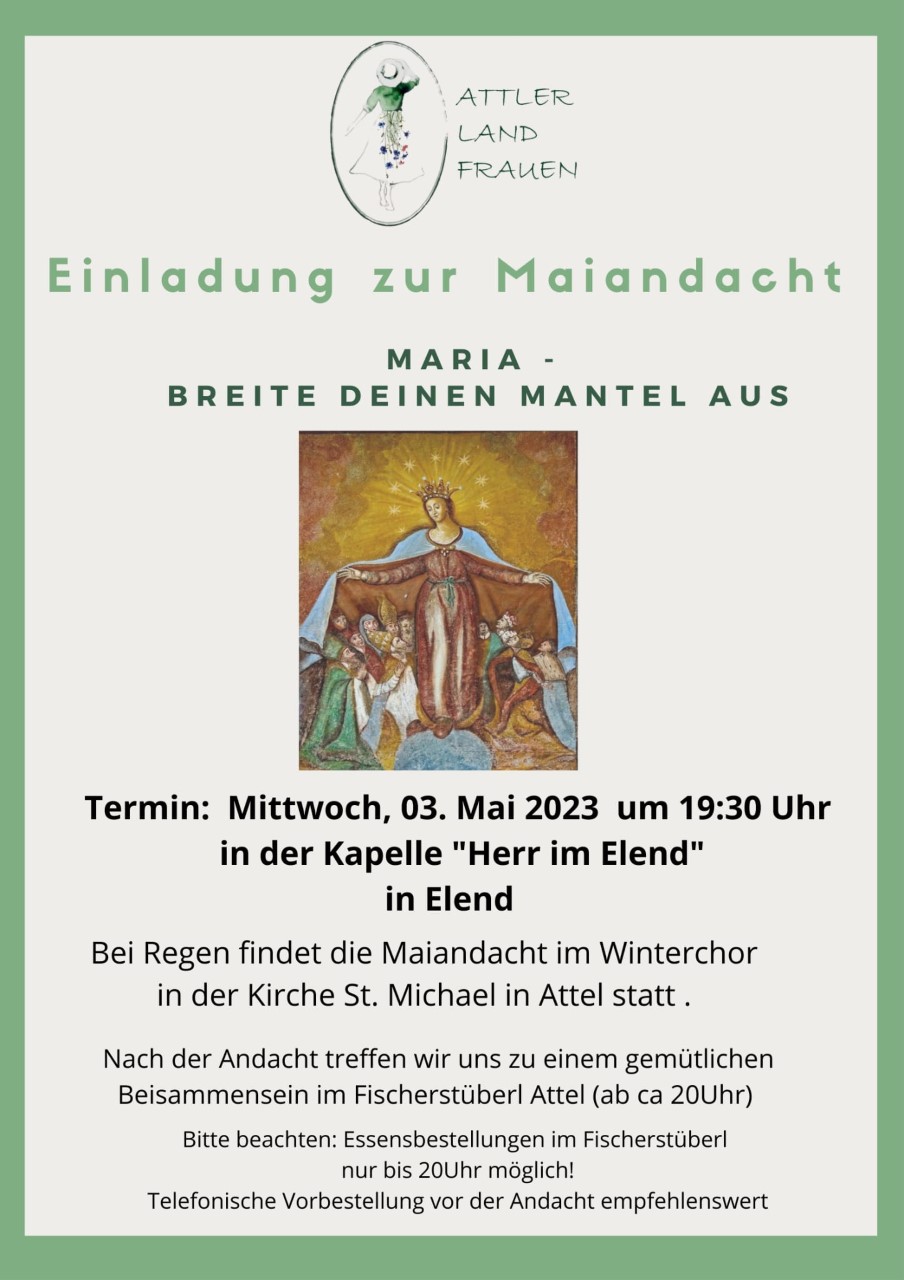 Der Mai gilt traditionell als Marienmonat. Aus diesem Grund wollen Attler Land Frauen am Mittwoch, 3. Mai, um 19.30 Uhr gemeinsam eine Maiandacht feiern. Bei schönem Wetter findet die Andacht in der Kapelle in Elend statt. Bei Regen im Winterchor der Kirche in Attel.Anschließend treffen sich alle zu einem gemütlichen Beisammensein im Fischerstüberl in Attel. Aus diesem Grund verschiebt sich der Stammtisch von Dienstag, 2. Mai, auf Mittwoch, 3. Mai, um 20 Uhr.
