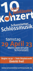 Am Samstag, 29. April, findet in der Schonstetter Mehrzweckhalle das Frühjahrskonzert der Schonstetter Schlossmusik statt. Anlässlich des 10-jährigen Bestehens der Schlossmusik erwartet die Besucher ein bunter Mix aus Highlights der vergangenen Jahre zusammen mit einigen Neuheiten.