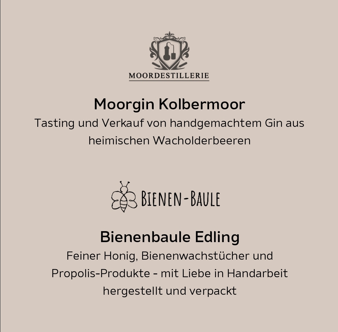 Ob feinen Honig aus Edling, Bioprodukte aus eigenem Anbau vom Finkennest oder etwas Beautyfeeling aus Obing – hier wird jeder fündig. Zum Schlemmen steht leckerer Gin und Wein bereit, außerdem Essen vom Chicago Foodtruck. Die Ausstellung gibt auch einer Hilfsorganisation Platz, das HUBER-Team heißt Schellen Sau e.V. herzlich Willkommen.