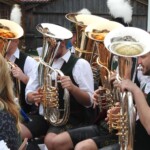 Was für ein Empfang – oben die Hochstätter Musi beim Einzug ins Dorf, unten die Buam mit Begrüßungstaferl und scheene Holz-Markerl zum Anhängen …