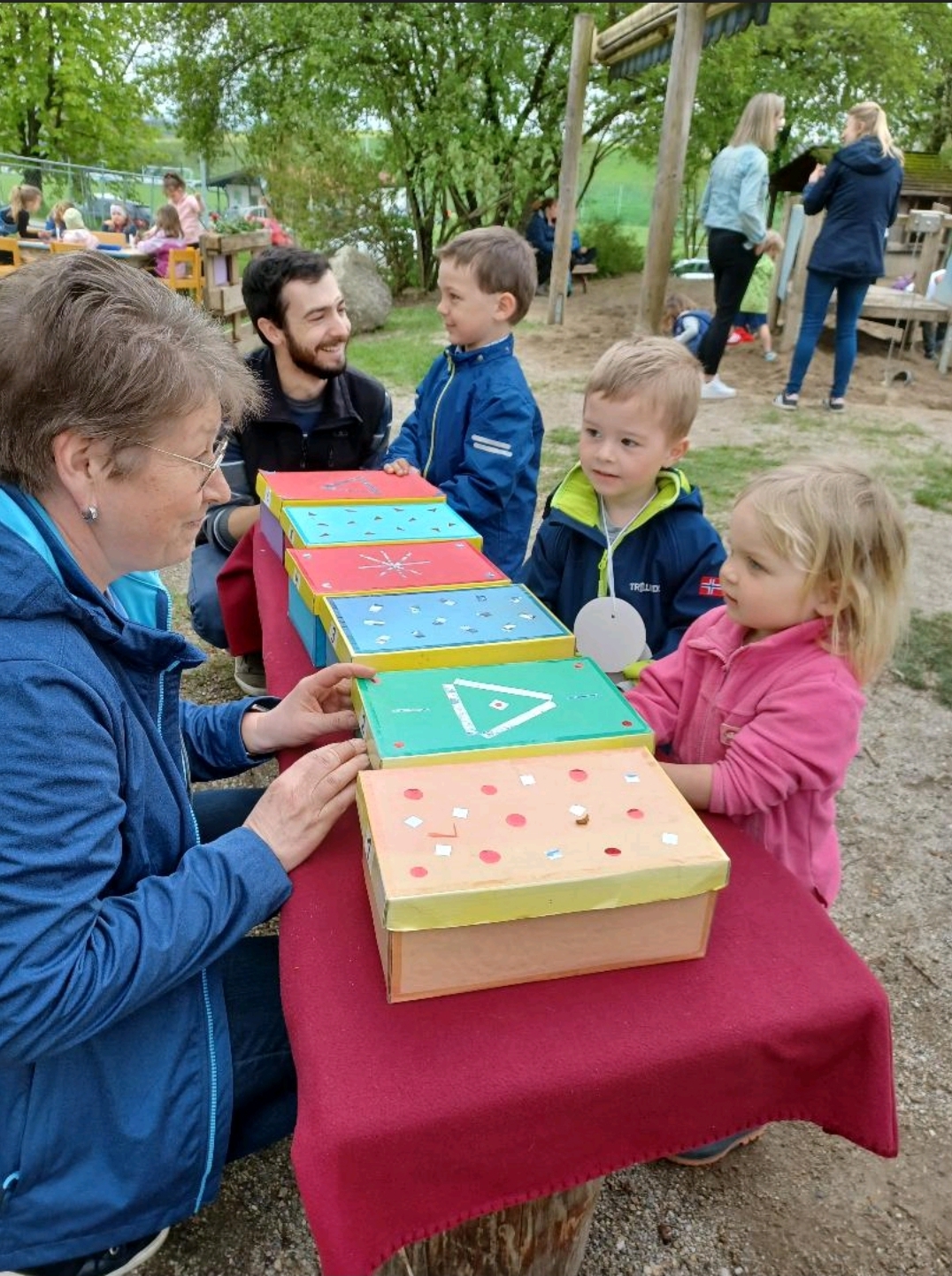 Ein Wiesenmemory, ein Wurfspiel, ein Bewegungsparkour, Elefantengolf, Spaghettiwettessen, ein Merkspiel, Fühlschachteln und der Bastel- oder Knettisch ließen keine Langeweile aufkommen. Besondere Highlights waren daneben noch die Suche nach den im Sand vergrabenen Murmeln und das Wissensquiz mit Fragen rund um den Kindergarten, bei dem die Kinder tolle Preise gewinnen konnten.